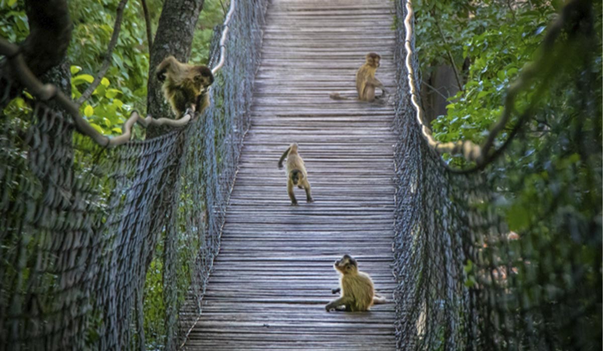 Em seguida, é feita uma leve caminhada pela trilha, passando por uma ponte suspensa, resultando em um percurso de aproximadamente 320 metros até a entrada da caverna, localizada em uma altura de 150 metros.